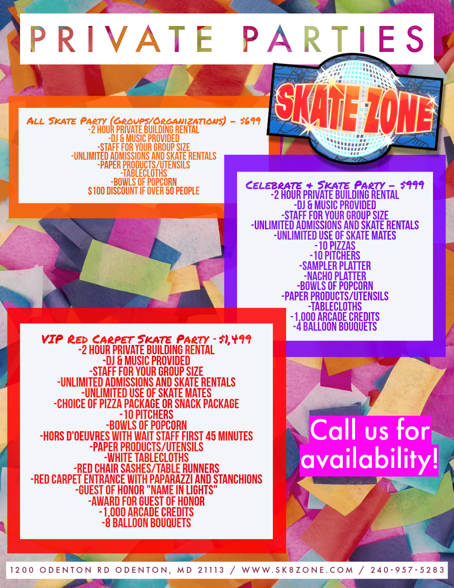 Enjoy the whole rink to yourselves! A $350 non-refundable deposit is required to book. 10% tax is additional for all parties. Depending on the time you are selecting, you can add an additional 30 minutes for $100 or an additional hour for $150. If you book for a weekday (Mon-Thu) you will receive a $100 Skate Zone Gift Card (for future use) as a bonus! Call us today for availability!